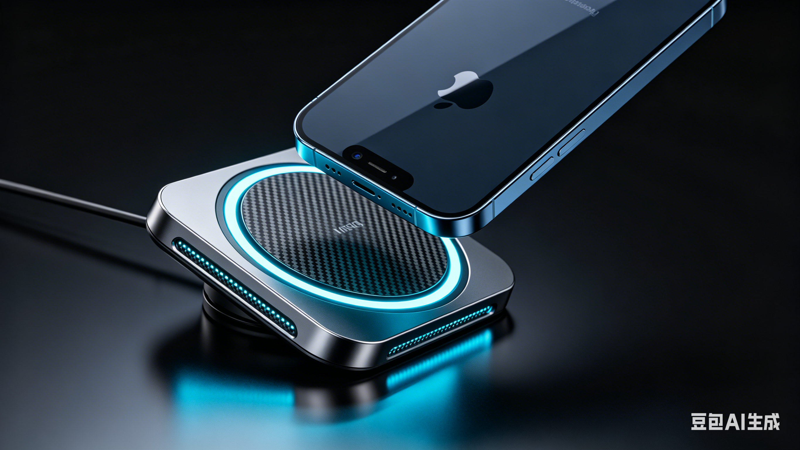 미래적인 무선 자기 충전기의 근접 촬영, 어두운 스튜디오, 청색 LED 링, 탄소 섬유 질감, 8K C4D 렌더링